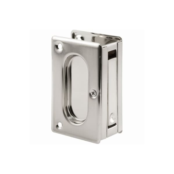 Satin nickel solid brass privacy lock and pull for a pocket door Fits doors that are 138 to 134 thick It is 334 tall by 212 deep and can be reversed from lefthanded to righthanded Carded