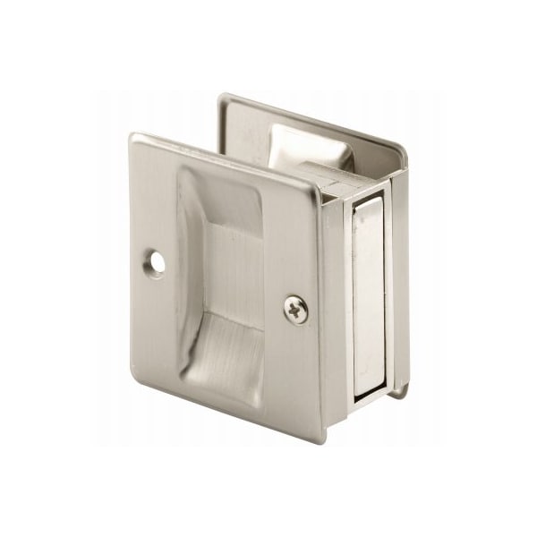 This is a door pull for a pocket door in satin nickel These are designed to fit pocket doors from 138 in to 134 in thick Nonhanded design for left or righthanded doors It is a solid brass construction with a satin nickel finish It fits on the edge of your door and will need to be mortised in