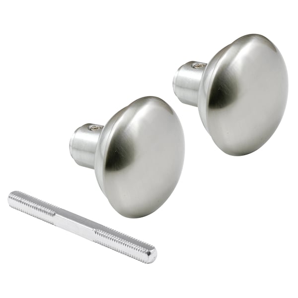 These vintage style door knobs are constructed of steel and come in a satin nickel finish. This set of knobs is designed for indoor use only, and it includes a 17/64 in. x 3-1/2 in. steel spindle with 3/8 in. -20 threads. This classic style knob set fits square drive spindle systems commonly found in antique and vintage door hardware sets, and it can adjust to accommodate different door thicknesses. The shanks on these knobs include set screws for fastening the knobs to the square spindle, but it does NOT include any of the following components and they must be purchased separately: The internal mortise lock body, the door rosettes, the trim and strike plates, or the latch and fasteners. For solid brass knobs, kindly see Prime-Line part E 2297. Note: This item cannot be used on pre-bored doors that have large, newer style door knob holes without first prepping them to receive this hardware. *Installation tip #1: Because the fasteners of the rosettes (purchased separately) require a solid surface to mount to, the large 2-1/8 in. (approximate size) holes must first be filled with a hardening filler, to then be able to receive the rosette fasteners. Products like Fix-It-All® and Bondo Body Filler® have worked well for some, but care must be used to avoid damaging any prefinished door surfaces during application and finishing. *Installation tip #2: Apply a small amount of Loctite ThreadLocker 271® to the set screw threads in the event they are loosening – Loctite® purchased separately.Perfect for replacing old style or antique knobs Used for interior doors such as bedroom, bathrooms and other interior door Features a 17/64 in. square drive spindle Satin nickel plated steel Ideal for use on interior latch sets Designed for doors that are 1-3/8 in. to 1-3/4 in. thick Slotted head screwdriver required for installation For further dimensional information, please see the line drawing