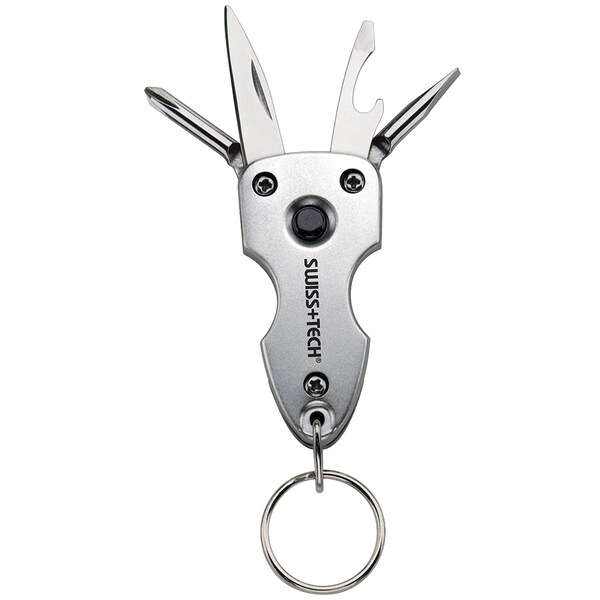 The SWISS+TECH represents a quantum leap in the art of micro-tool making. They are compact, easily transportable tools that combine craftsmanship and innovation to create a new category of patented consumer products--Key Ring Tools. Unlike all other multi-function tools, many SWISS+TECH tools have a patented, quick-release, integrated locking system that attaches to any key ring, thereby eliminating the need for an additional ring or belt holster. These innovative, high quality, lightweight products fulfill a common need--having the tools you need when you need them. They make a great gift. The Key Ring Multi-Tool 7-in-1 offers a range of handy tools on your key chain that are with you when you need them including an LED flashlight, Phillips screwdriver, knife, awl, bottle opener, flat screwdriver and key ring. Each tools snaps into position for stability, and the built-in flashlight with a soft-squeeze on/off button and an ultra-bright, 100,000+-hour LED lights your work. Replaceable batteries are included.