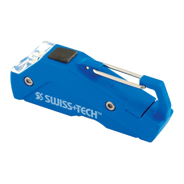 This SWISS+TECH Personal Care Tool includes an LED light, scissors, tweezers, flathead driver and nail cleaner, nail file, and carabiner clip. Quick clip keeps the tool handy wherever you go. Push-button LED flashlight with replicable batteries included. This item comes with a blue plastic housing. Covered by SWISS+TECH' s limited lifetime warranty.