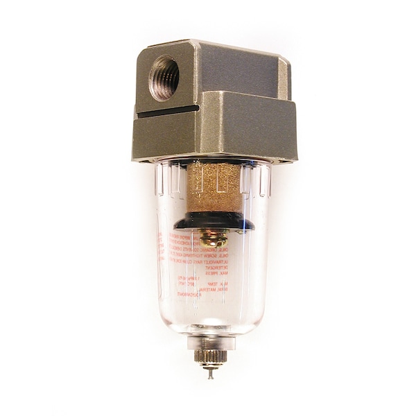 The Primefit F1401 Mini Air Filter is designed for use with any compressor, air tank or air system and filters unwanted dirt, debris and moisture from air lines. This filter can operate at pressures between 0 to 145-PSI (pounds per square inch). The F1401 features a brass filter element capable of filtration up to 40-microns. A removable polycarbonate bowl and manual drain allow for easy maintenance. This filter's small compact design is ideal for portable compressors and smaller air systems.