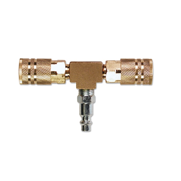 The Primefit M1404-4 2-Way T-Style Air Manifold is a splitter that features (2) 1/4-inch industrial style output couplers and a 1/4-inch quick connect input plug. This manifold easily splits air lines into (2) separate lines and has durable brass construction. The couplers feature a 6-ball bearing contractor-grade design for long life and corrosion resistance. The industrial interchange is compatible with industrial, "M", "D", and "I/M" style plugs and couplers.