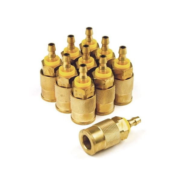 The Primefit IC3814PB-B10-P (10-Pack) Industrial M-Style Brass Coupler 3/8" x 1/4" Push on Barb. Industrial/ M-Style Interchange, with 6 locking steel balls for increased life and holding power. Nitrile seals for performance in extreme temperatures, and solid brass construction for high corrosion resistance and longer life.