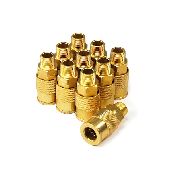 The Primefit IC3838MB-B10-P (10-Pack) Industrial M-Style Brass Coupler 3/8" x 3/8" Male NPTwith 6 locking steel balls for increased life and holding power. Nitrile seals for performance in extreme temperatures, and solid brass construction for high corrosion resistance and longer life.