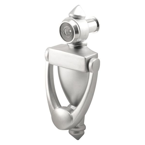 This decorative door knocker and viewer is constructed of diecast materials and comes in a satin nickel finish. Its vintage design extends a total of 5-1/2 inch tall and features a 180 degree angle of view. This door knocker and viewer can be installed on doors from 1-3/8 inch thick to 1-3/4 inch thick, with a required 9/16 inch inside diameter hole for installation of viewer. The integrated door viewer within this door knocker is designed to help keep you safe when answering your door and is ideal for day or night viewing with adequate exterior lighting. This door knocker and viewer is easy to install and it is used by many. See Prime-Line part S 4793 for a door viewer inside cover. Inside viewer covers (not included with this item) prevent reversed visibility through door viewers from the exterior of the home, increasing the security and privacy of your home.
