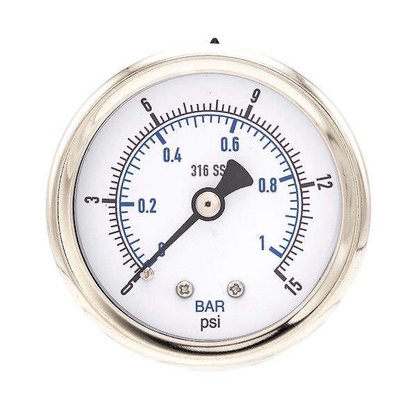 PRESSURE GAUGE, 2 in DIAL, 0-15 PSI, 1/4 in CENTER BACK MOUNT, STAINLESS STEEL CASE, 316SS INTERNALS, DRY/FILLABLE