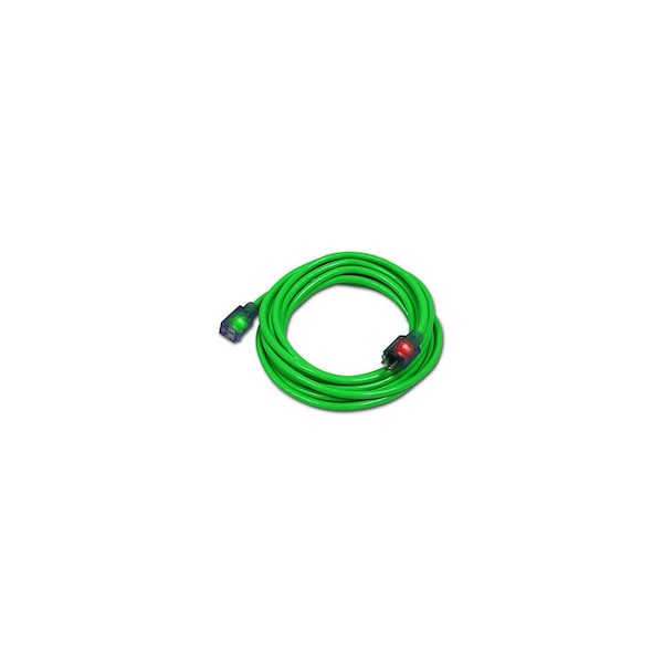 50ft, 14/3, SJTW, Green, Pro Glo Extension Cord, Heavy Duty Cold Weather PVC Cord Has The Latest Safety Features That All High Profile & Hazardous Job Sites Require, Fully Safety Compliant & Its Patented CGM Connector Features A Continuous Green Ground Check Light That Lets You Know The Cords Electrical Current Is Safely Grounded, Pro Glo High Visibility Vinyl Jacket Insures The Cord Will Retain Its Flexibility In Temperatures Down To -40 Degrees Fahrenheit.