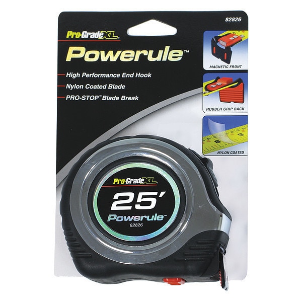 The PROGRADE 82826 Powerule Tape Measure is an essential tool for your job. It has a 1" wide blade, which measures 25 feet long. The rubber grip gives you the comfort and control you need while measuring. The tape measure also features a belt clip that can be easily removed. With the PROGRADE 82826 Powerule Tape Measure by your side, you'll get the job done quickly and efficiently.
