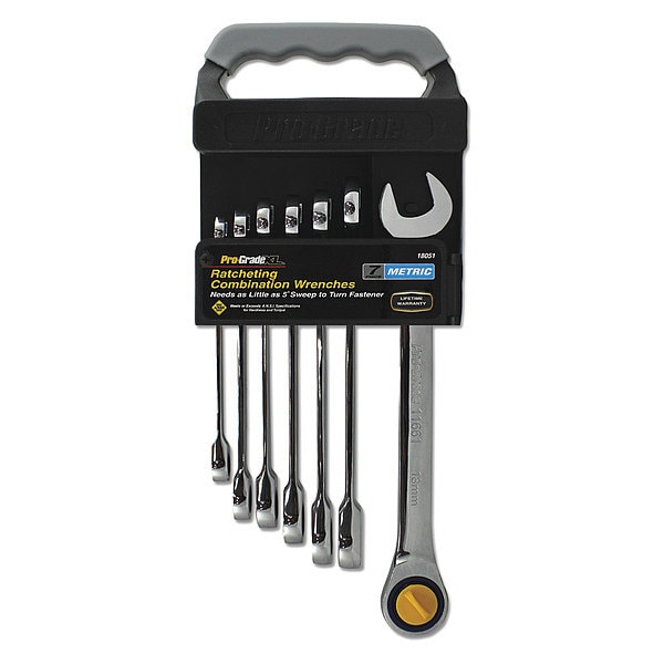(7) Ratcheting Combination Wrench Set: (1) 8mm, (1) 10mm, (1) 12mm, (1) 13mm, (1) 14mm, (1) 15mm, (1) 18mm; (1) Storage Rack