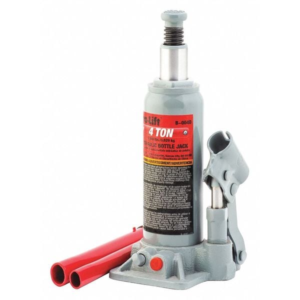 Bottle Jack,Hydraulic,4 tons, Load Capacity 4 ton, Body Material Steel, Lifting Actuator Manual Handle, Minimum Lift Height 8 in, Maximum Lift Height 15 1/4 in, Power Source Mechanical, Standards ASME, PASE, Base Length 4 1/4 in, Base Width 4 in, Extension Screw Length 2 3/8 in, Features Extension Screw Adjusts to Accommodate Work Height, Heat Treated Critical Stress Areas, Ideal for Auto, Truck Service, Farm, and Shop Use, By-Pass Device Protects Against Over-Pumping