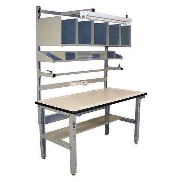 Packing Table, Tabletop Material Laminate, Overall LxWxH 72 in x 34 in x 84 in, Weight Capacity 750 lb, Adjustable Height Height Adjustable, Frame Material Steel, Color Gray, Height Increments 6 in, Frame Finish Powder Coated, Tabletop Finish Laminate, Includes 60 in Uprights, Bin Holder, Corrugated Storage Shelf with Four 12 in x 18 in Dividers and Shop Light, Enclosed Metal Shelf with Four Dividers, Lower Metal Shelf, Paper Spool Holder, Six Outlet Electric Supply