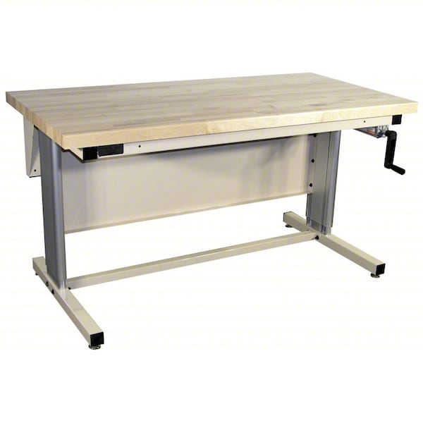 Ergonomic Work Bench, Height Adjustability Adjustable Height, Top Material Maple, Assembly Unassembled, Color Beige, Frame Material Steel, Leg Type Cantilever Leg, Maximum Adjustable Height 42 in, Minimum Adjustable Height 30 in, Non-Metal Top Thickness 1 3/4 in, Number of Cabinets 0, Number of Drawers 0, Number of Knockouts 0, Included Components Stringer, Number of Shelves 0, Overall Depth 30 in, Overall Fixed Height Not Applicable, Overall Load Capacity 500 lb, Overall Width 60 in