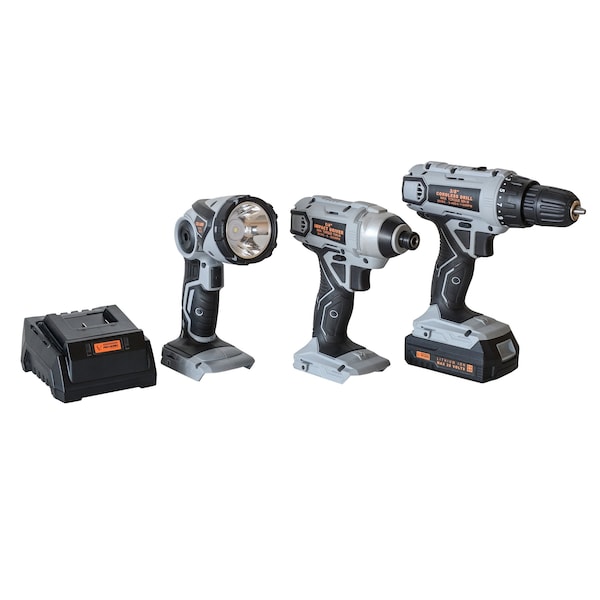 The Pro-Series 5 Piece Combo Kit with 3/8 inch Drill, 1/4 inch Impact Driver, LED Flashlisht and 20V Lithium Ion Rechargeable Battery and Charger Set provides the power need to complete a range of projects on the job site or around the house. This 5 piece cordless tool kit by Pro-Series includes one 3/8 inch drill, one 1/4 inch impact driver, one 20V lithium ion battery, one charging base and one LED cordless flashlight.Features shared by the Pro-Series 20 Volt Drill and Driver Set include a keyless chuck to make changing bits easy and a LED on the base to illuminate the work area. Compact, lightweight and ergonomic handles with belt clips and straps on the handle make these drill and driver easy to use.The variable two speed 3/8 inch Cordless Drill features a keyless chuck, 250 lbs of torque, a forward and reverse switch and 19 plus 1 torque settings. The variable speed 1/4 inch Cordless Impact Driver features variable speed, lock control and a max torque of 110Nm. A quick charge base can fully charge the Pro-Series 20 Volt Lithium Ion Battery in just an hour. The LED Flashlight is an adjustable work light with a head that swivels up and down 90 degrees to help illuminate the job.