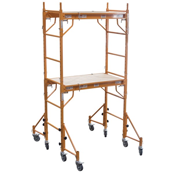 Access hard to reach places with the Pro-Series Rolling Interior Mini Scaffold Tower. Eight 4" hard rubber dual locking swivel casters keep the unit safely in place Two plywood platforms adjust in height from 21.5" to 79". Steel frame construction with 1/2" thick wooden deck, platform dimensions: 40" L x 21.25" W Interior use only, 500 lbs. capacity, Overall dimensions: 84" H x 49.25" L x 43" D Tower set includes: 4 pcs. scaffold ladders, 2 decks, 4 outriggers, 20 locking pins, and 8 casters.