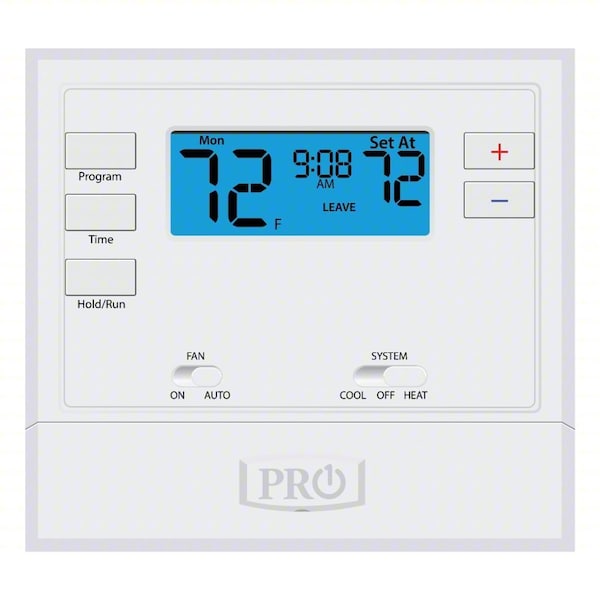 Low Voltage Thermostat, Stages Heat 1, Stages Cool 1, Temp. Settings per Day 4, Programs per Week 5-1-1, Terminal Designations B, G, O, RC, RH, W, Y, WiFi Capability No, System Switching Heat-Off-Cool, Fan Switching Auto-On, Display Size 2 sq in, Display Type Backlit, Display Color Blue, Key Pad Lockout No, Programmable Fan No, Automatic Changeover No, Humidification Control No, Dehumidification Control No, Remote Sensing Capability No, Temporary Program Override Yes