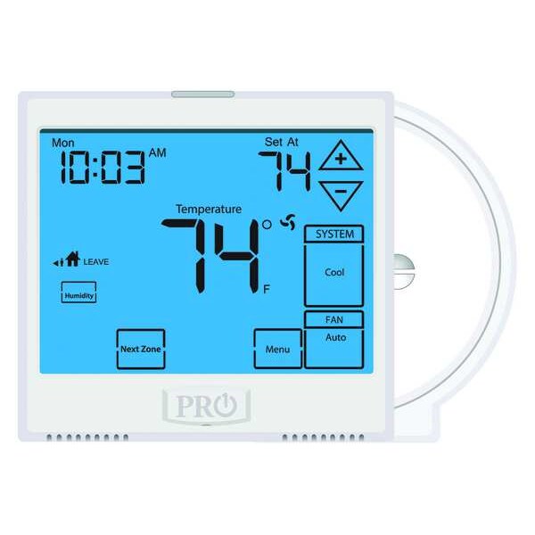 Low Voltage Thermostat, Stages Heat 3 Heat Pump or 2 Conventional, Stages Cool 2, Temp. Settings per Day 4, Programs per Week 7, 5-1-1, or Nonprogrammable, Terminal Designations B, C, D, G, H, O, RC, RH, W/E, W2, Y, Y2, WiFi Capability No, System Switching Auto-Heat-Cool-Off-Emergency, Fan Switching Auto-On, Display Size 13 sq in, Display Type Backlit, Display Color Blue, Key Pad Lockout Yes, Programmable Fan Yes, Automatic Changeover Yes, Humidification Control Yes, Dehumidification Control Yes