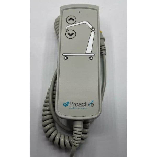Replacement hand control for Proactive Medical patient lifts. Features an 8-pin connector with a coiled cord and hook.