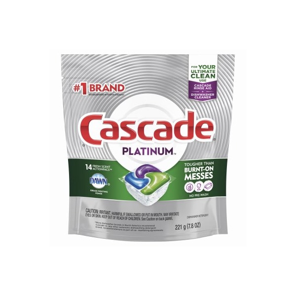 Cascade, 14 Count, Platinum Action Pacs, Fresh Scent, Advanced Triple Action Formula That Helps Prevent Residue On Your Dishes Even Filming On Your Machine, Scrubs Away Tough 24 Hour Stuck On Food, Eliminates The Need To PreWash Dishes, Has The Grease Fighting Power Of Dawn