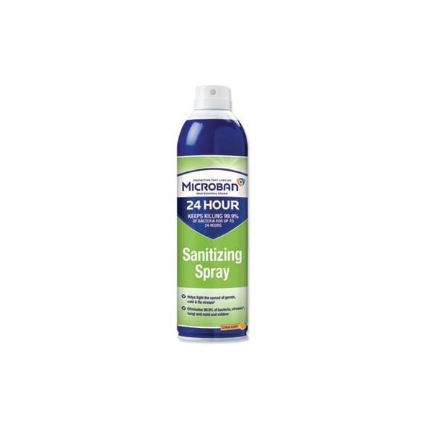 Microban 24 Hour Sanitizing Spray is an EPA registered aerosol sanitizer that provides up to 24-hour protection against Staphylococcus aureus and Enterobacter aerogenes bacteria on hard surfaces when used as directed. Featuring a light citrus scent, Microban Professional Sanitizing Spray sanitizes hard surfaces in as little as 10 seconds, killing 99.9% of bacteria in five minutes and protecting against bacteria growth touch after touch for 24 hours. This aerosol sanitizer spray is ideal for cleaning soft surfaces such as backpacks, luggage, curtains, cushions, mattresses and other fabrics. Microban's antimicrobial protection is effective against most common bacteria, mold and mildew that cause stains, odors and product degradation. It also helps fight the spread of germs and cold and flu viruses Respiratory Syncytial Virus RSV, Influenza A H1N1, Human Coronavirus on hard, nonporous surfaces when used as directed. Application: Disinfectant; Applicable Material: Appliance Exteriors; Backpacks; Beverage Dispensers; Chairs; Curtains; Cushions; Door Handles; Elevator Buttons; Hand Railings; High Chairs & Booster Seats; Laminated Menus; Luggage; Tables/Counter Tops; Trash Receptacles; TV Remotes; Upholstery; Chemical Compound: Quaternary Ammonium Compounds 0.20%; Dirt Types: Bacteria; Fungi; Mold; Viruses including SARS-CoV-2.
