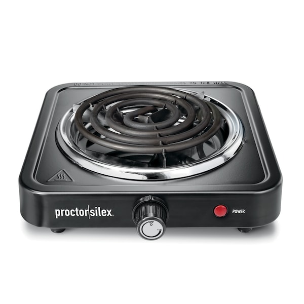 Not only does the Proctor Silex® Single Burner Cooktop heat up quickly with 1200 watts, but it also provides a range of heating options from high to warm for maximum cooking and serving versatility. It's perfect for quickly boiling water for tea or pour-over coffee and it's ideal anywhere you need extra cooking space or a place to keep food warm until serving time. Since it's portable and compact, it's easy to move from place to place and even easier to store. Whether you need an extra burner for holiday cooking, are doing home renovations or plan to go camping, the Proctor Silex Single Burner Cooktop gives you all the cooking convenience you need. It works with all types of cookware and since the coil is hinged, you can lift it up to quickly wipe spills from the plate underneath. Convenient non-slip rubber feet grip surfaces and your kitchen countertop to help prevent sliding and the power indicator light lets you know when the cooktop is plugged in and ready to use.