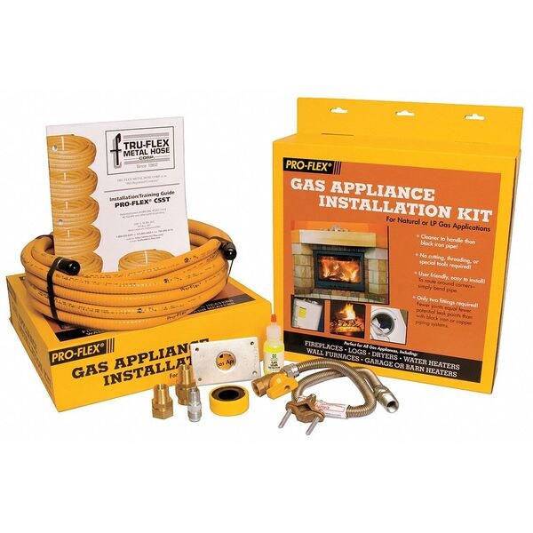 Single Appliance Gas Installation Kit, Flexible, Hose Material 304 Stainless Steel, Cover Material Low Density Polyethylene, Color Yellow, Overall Length 25 Ft., Max. Pressure 5 PSI, Connection Size 1/2 In., Fitting Material 360 Brass, Fitting Type Male Thread, Tube Size 1/2 In., Temp. Range 1000 F, Dia. 1/2 In., Application Gas Piping, For Use With LP or Natural Gas, Includes Gas Piping, Fittings, Ball Valve Connector, Tape, Bottle of Leak Detector, Clamp, Installation and Training Guide