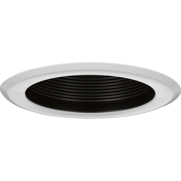 5" Step Baffle Trim in a Black finish and bright white powdered painted metal flange. UL and CUL listed for damp locations. The trim uses friction springs to attach to the housing to provide a flush fit against the ceiling. Compatible for use in Progress P851-ICAT.