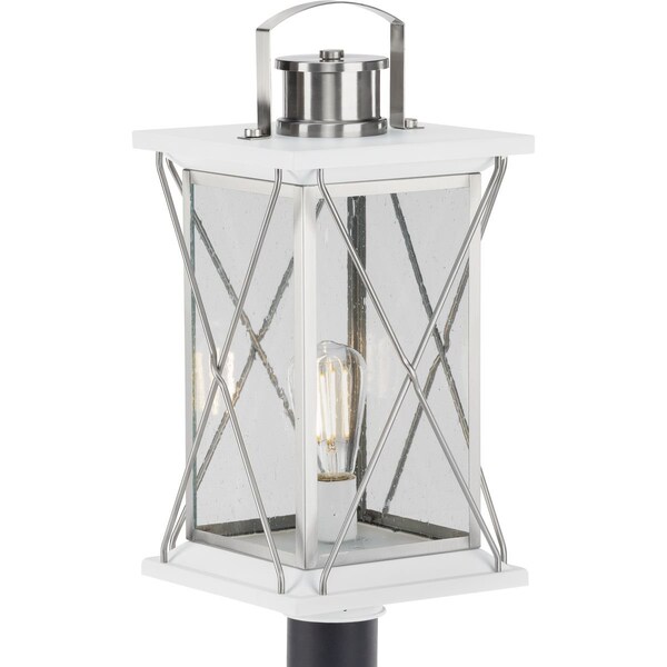 Transform your home into a warm and cozy dream with the friendly farmhouse-style of this post lantern. A rustic X-brace design decorates each side of the charming lantern silhouette. Clear seeded glass panes add an extra pop of rustic personality. A stainless steel finish complemented with white accents adds warmth and character as the lantern infuses your home with gentle illumination.
