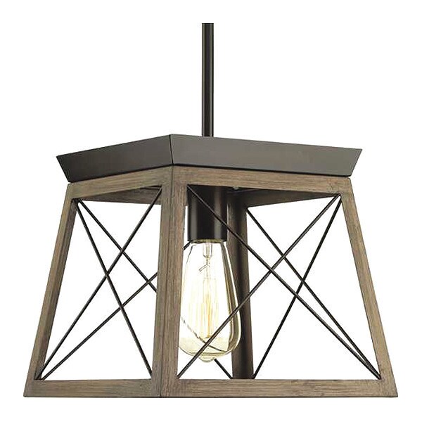 The Briarwood collection features a classic pattern commonly found on barn or farmhouse doors and gates. The simple geometric form features a faux-painted wood enclosure to frame vintage-style light bulbs. A rich oak finish and Antique Bronze combination.
