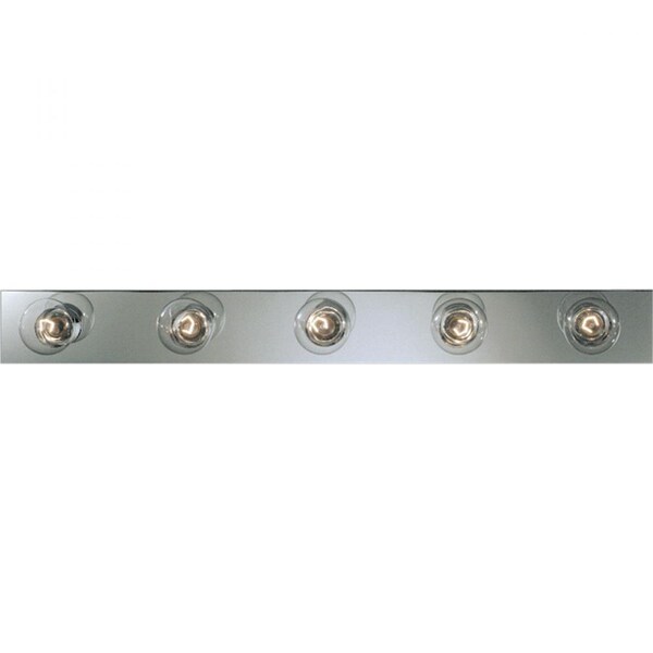 Basic Broadway Lighting strips use fewer lamps to lower the overall wattage per strip. This five-light bath strip with sockets on 7-1/2 inch centers gives an even spread of illumination. UL listed for ceiling mounting with 25w maximum lamps. Complete with a brilliant metallic finish.
