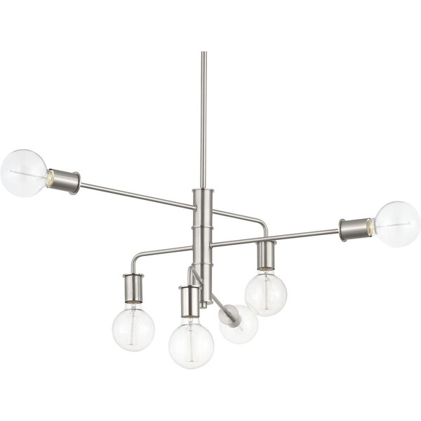 Calder collection of fixtures celebrates the elegance of movement with a graceful articulating center column. Pivoting arms provide a nearly endless array of configurations to complement the asymmetric design. This design is suitable for open floor plans, great rooms or anywhere a dramatic focal piece is needed to make a bold statement. The minimal form provides a perfect showcase for vintage or globe style light bulbs. Six-Light Chandelier with a Brushed Nickel finish.