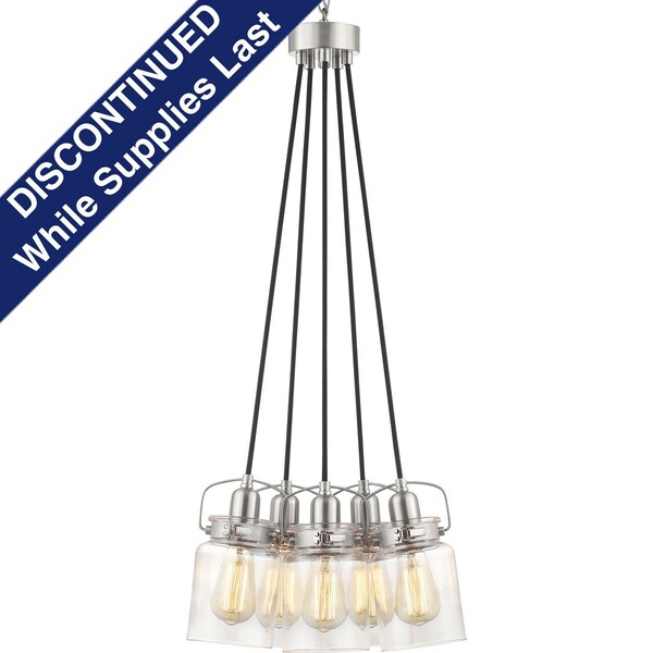 A trend in home decor is the repurposing of antique pieces. Calhoun playfully follows this trend with an apothecary style clear glass diffuser held in place with a mechanical latch from a spice container. A glass shade showcases a thickened profile to create a vintage-style surface for a classic handmade appearance. The vintage design is a perfect complement to several decor styles including the popular Farmhouse trend. Calhoun is a versatile style that can be displayed in three different ways: assemble with the included optional spanner and long or short stems for a unique cord-hung style chandelier, or let the lights hang in a more casual cluster. Five-Light Chandelier with a Brushed Nickel finish.