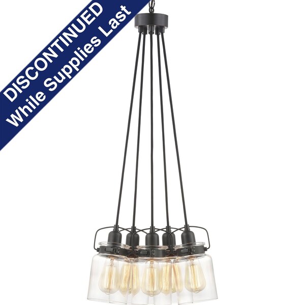 A trend in home decor is the repurposing of antique pieces. Calhoun playfully follows this trend with an apothecary style clear glass diffuser held in place with a mechanical latch from a spice container. A glass shade showcases a thickened profile to create a vintage-style surface for a classic handmade appearance. The vintage design is a perfect complement to several decor styles including the popular Farmhouse trend. Calhoun is a versatile style that can be displayed in three different ways: assemble with the included optional spanner and long or short stems for a unique cord-hung style chandelier, or let the lights hang in a more casual cluster. Five-Light Chandelier with an Antique Bronze finish.