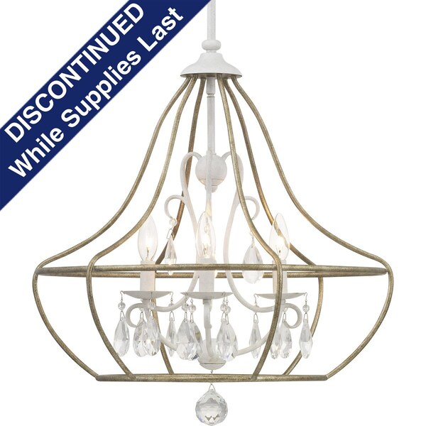 Inspired by the charm of a European countryside, Fleurette is ideal for Farmhouse and Transitional spaces. Its design features a striking juxtaposition of the rustic and the sophisticated. Glass ornaments adorn curved arms that create an elegant interior frame. The three-light chandelier is finished in Cottage White and is embraced by an outer open frame in Gilded Pewter.