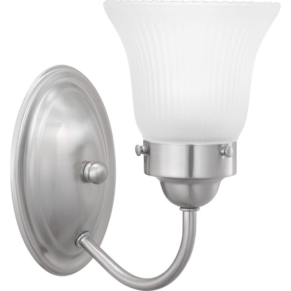 The one-light Fluted Glass Collection bath fixture features an etched glass shade that is nestled in a decorative ring extended by curving arms in a Brushed Nickel finish. Timeless in its classic appeal, this light is stylish for both new and restored homes.