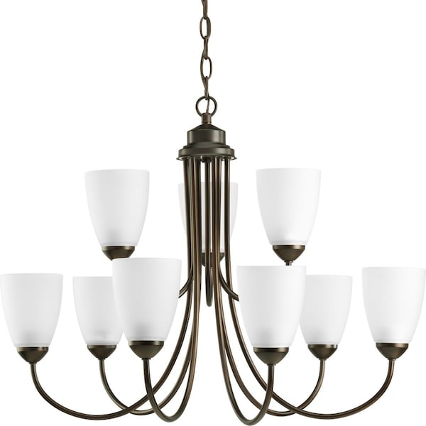 Nine-light, two-tier chandelier from Gather possesses a smart simplicity to complement today's home. Antique bronze metal arms descend downwards and curve sharply to prop white etched glass shades. Etched glass add distinction and provide pleasing illumination to your room. Coordinating fixtures from this collection let you decorate an entire home with confidence and style. 10 feet of 9 gauge chain is supplied for ceiling chain mount.