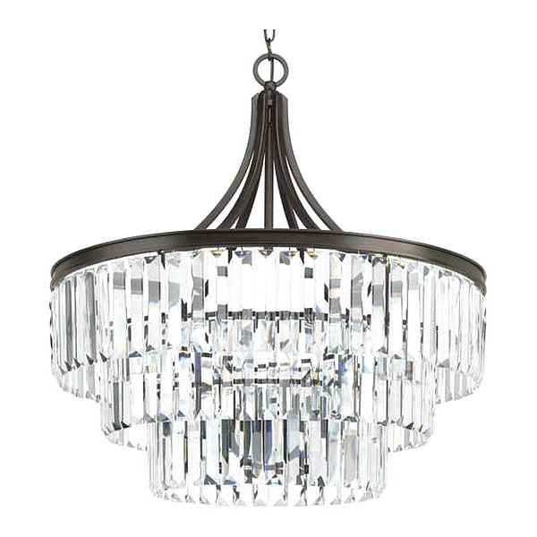 Elements that sparkle create an instant statement within the home, making the Glimmer collection the definition of livable luxury. An architecturally styled frame in an Antique Bronze finish supports the prismatic glass pendants.