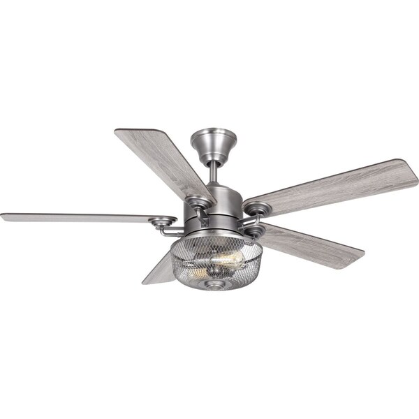 This five-blade 54 inch Greer ceiling fan complements either industrial or farmhouse decor. It comes with a wire meshed shade light kit that uses two vintage LED lamps (Included) and remote control with batteries are also included. Hang it on a flat or slopped ceiling with its dual mount system.