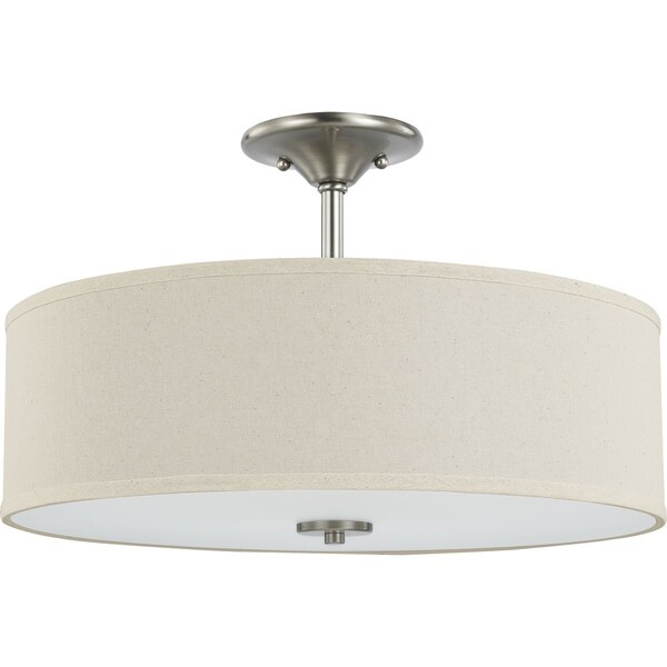 Harkening back to a simpler time, the Inspire Collection Brushed Nickel Three-Light Semi-Flush Mount's timeless demeanor is sure to become a favorite for generations. A round, off-white linen shade with an etched glass diffuser steals the show and creates a beautiful muted glow. Understated metal accents complement the light fixture as it fosters a casual, friendly atmosphere.