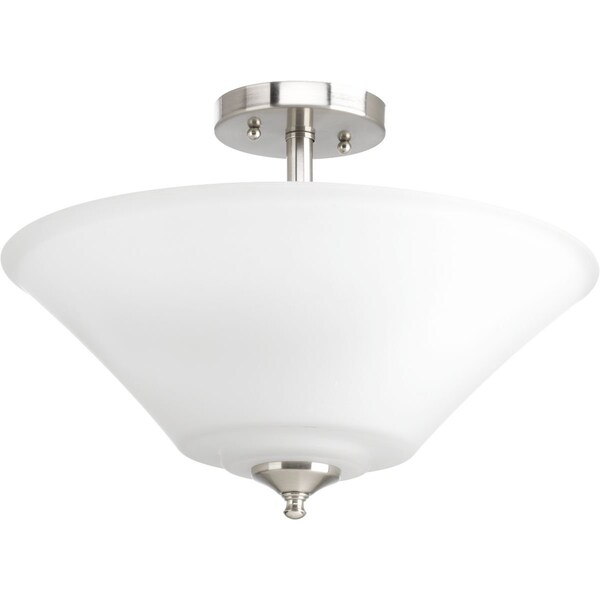 Gleeful simplicity defines the Joy Collection. Refreshing and fashionable, arcing forms of metal and fluted glass shades are enhanced by a classic Brushed Nickel finish. One white etched glass complete the look and allows you to coordinate well with other fixtures from this collection. Bring joy into your heart and into your home with this wonderful three-light semi-slush fixture. Can also be chain hung.
