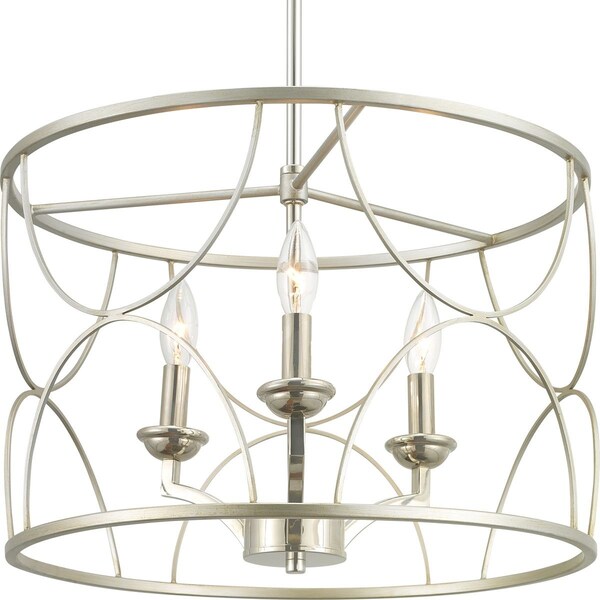 A three-light inner cluster in Polished Nickel appears to float inside a Silver Ridge geometric outer cage in this Landree Collection chandelier. The frame is designed to dramatically surround each fixture, presenting depth, dimension and beauty. The exaggerated scale and elegant accents are suitable for Modern and Luxury design styles.