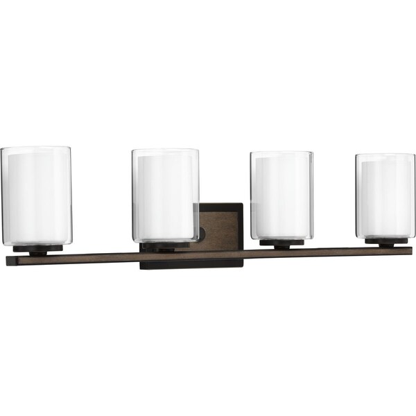 Inject a down-to-earth vibe that invites you to breathe easy in any bath and vanity setting with the Mast four-light bath. Four clear, etched glass shades create a candle-like appearance as they grace a smooth, clean bar affixed to a rectangular backplate. Both the bar and backplate feature an earthly faux wood texture accented by a beautiful Antique bronze finish, making the piece ideal for coastal and modern farmhouse settings.