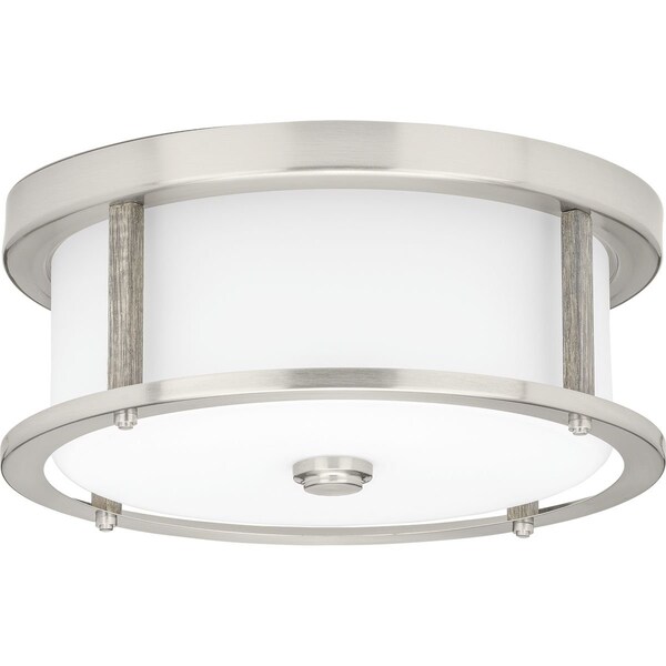 Rejuvenate from the rush and flurry of a busy day with the Mast two-light flush mount. The incorporation of faux wood accents and an oversized, Brushed Nickel frame holding etched glass shades creates a natural and organic touch for bathrooms, living rooms, and bedrooms in coastal and modern farmhouse interiors.