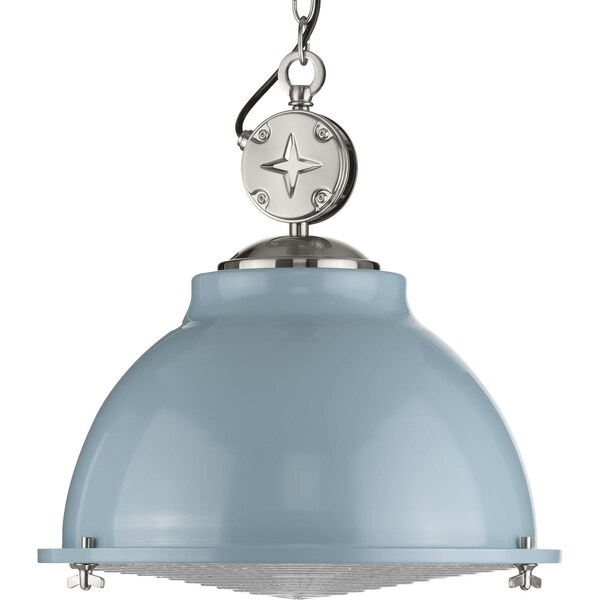 Inspired by vintage automobile engines, this pendant boasts a signature star motif for added industrial character. The smooth metal shade is coated in a beautiful coastal blue finish. The shade holds a prismatic glass diffuser primed for providing optimal task lighting.