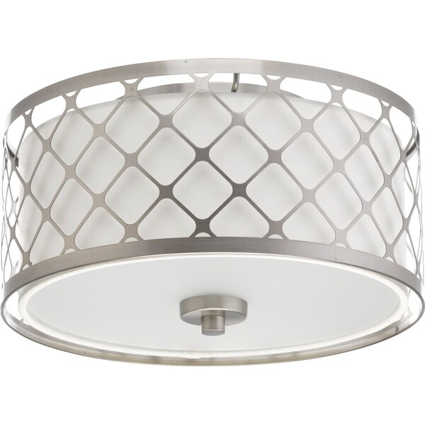 One-light LED 14" flush mount features a modern square pattern in a Brushed Nickel metal shade that surrounds a summer linen fabric shade with a glass diffuser. 3000K, 90+ CRI 1,211 lumens 71.2 lumens/watt per module (source).