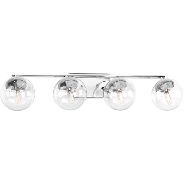 Giving a nod to the space age with mid-century modern appeal, Mod features a sleek linear frame in a Polished Chrome finish. Clear, spherical glass shades offer the perfect focal point for vintage bulbs or reflector-style globes. This four-light fixture can be used in the bath and vanity works with wide variety of styles.