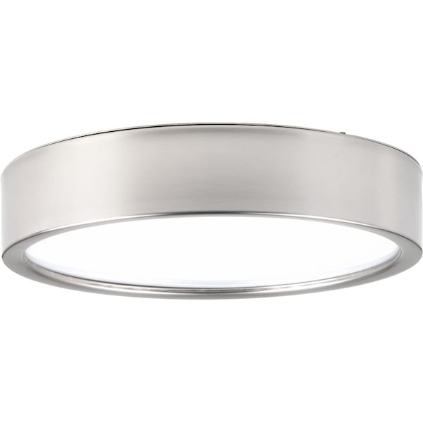 Industrial style LED flush mount adorned with industrial-inspired accents and white acrylic diffuser. One-light 29W LED 3000K, 90+ CRI in a Brushed Nickel finish.