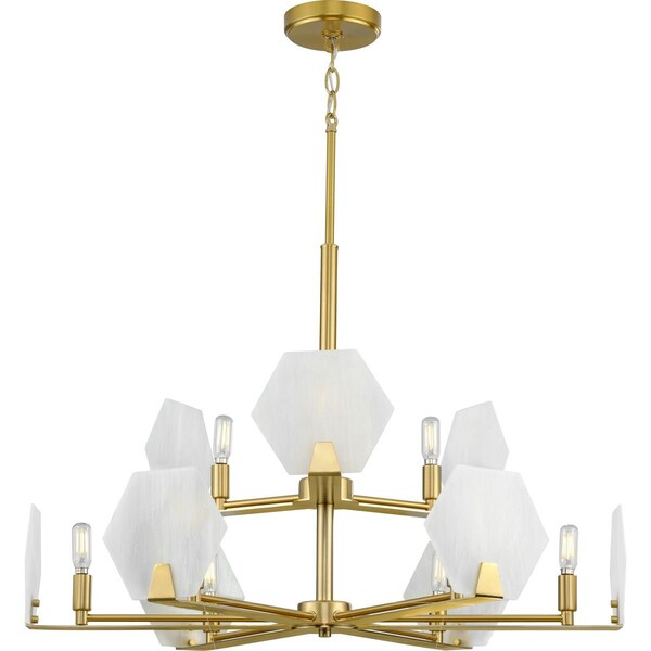 Execute bold visions and design statements with the Rae Collection's Nine Light Chandelier. A blend of geometric shapes and a sculpted hand artisan frame allows this light fixture to double as a stunning work of art. A glowing golden finish brings this modern chandelier to life for an awe-inspiring lighting experience guaranteed to spark conversation amongst your gazing guests.