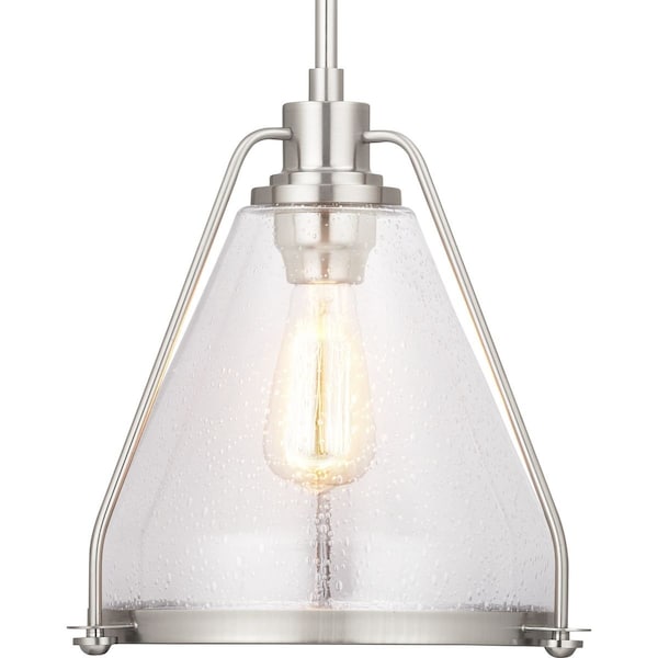Range features a classic triangular clear seeded glass shade. The simple geometric glass is outlined with a Brushed Nickel slender frame and finished with a bottom metal accent ring. Simple and stylish, this versatile style is suitable for a variety of designs, such as Modern, Farmhouse and Urban Industrial.