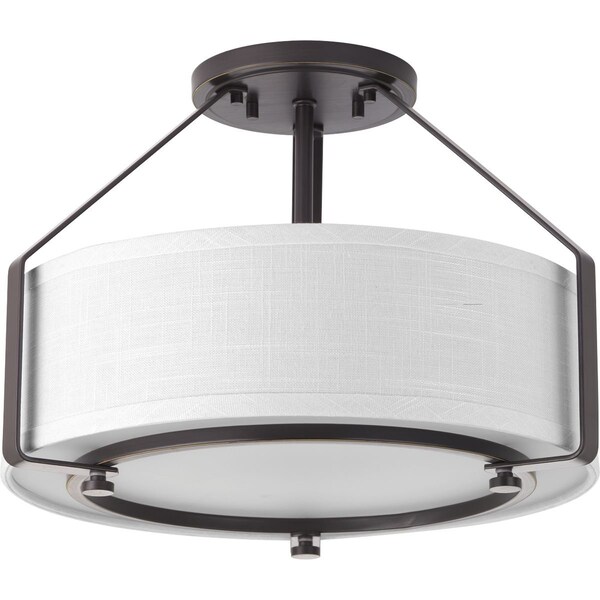 The three-light semi-flush offers a sleek metal frame that supports a low-slung shade to create Ratio’s casual modern style. The frame’s proportion to the white linen drum shade evokes a perfect ratio for lighting. Includes a polished glass exterior, etched glass interior diffuser that offers an elegant appeal and is easier to clean – offering both fashion and function. This fixture can be mounted as a semi-flush or used as a hanging pendant for a wide variety of applications. Antique Bronze finish.
